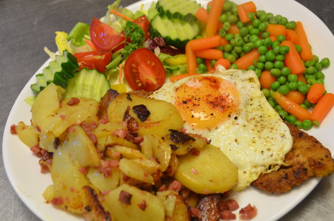 Rührei in verschiedenen Variationen mit Schwarzbrot und Salatgarnitur